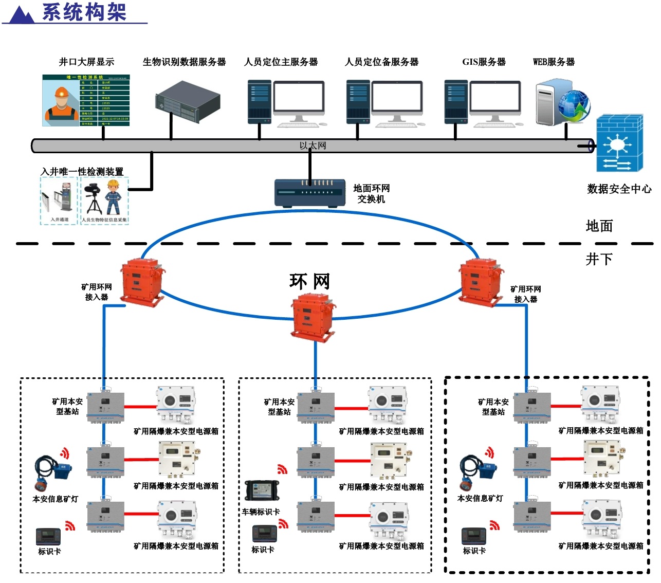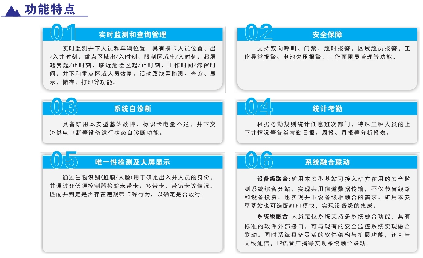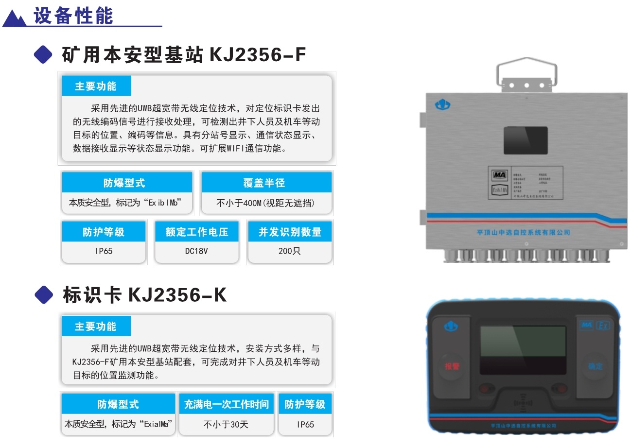 產(chǎn)品簡介:KJ2356J煤礦井下人員精確定位系統(tǒng),采用超寬帶無線(UWB)、慣性測量單元(IMU)、到達時差法(TODA)等多源融合定位方法,實現(xiàn)井下移動目標定位精度小于0.3米的井下類GPS系統(tǒng)。該系統(tǒng)不僅強化了人員位置的精準感知,實現(xiàn)煤礦井下作業(yè)人員位置的監(jiān)測管理、報警、各類數(shù)據(jù)查詢及報表功能。同時支持與車輛定位融合,將精準定位技術(shù)應用到井下機車、采掘裝備等各類設(shè)備。該系統(tǒng)具有定位精度高、抗干擾能力強,系統(tǒng)容量大、安裝使用簡便等特點,對煤礦高效生產(chǎn)和應急教援具有十分重要的意義。該系統(tǒng)不僅強化了人員位置的精準感知,實現(xiàn)煤礦并下作業(yè)人員位置的監(jiān)測管理、報警、各類數(shù)據(jù)查詢及報表功能。同時支持與車輛定位融合,將精準定位技術(shù)應用到井下機車、采掘裝備等各類設(shè)備。